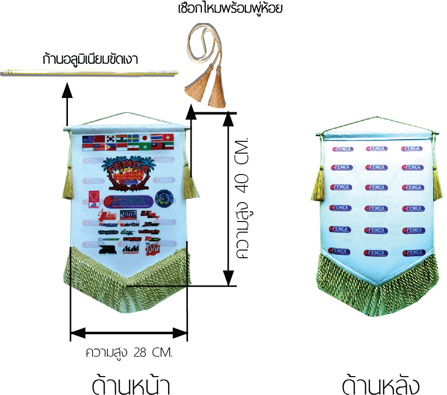 ประกอบ ด้วยตัวธงขนาด กว้าง 28 cm.สูง 40 cm. สามารถพิมพ์โลโก้ได้ 2 ด้าน